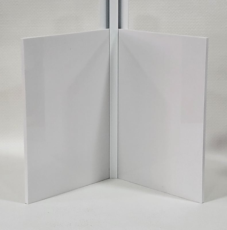 Bij gebruik van een inschuif hoekprofiel als binnenhoek, moet de plaat 10mm kleiner gemaakt worden dan de breedte van de muur. Op de achterste plaat van een U douche komen twee inschuifhoekprofielen en moet je deze dus 20mm kleiner maken.