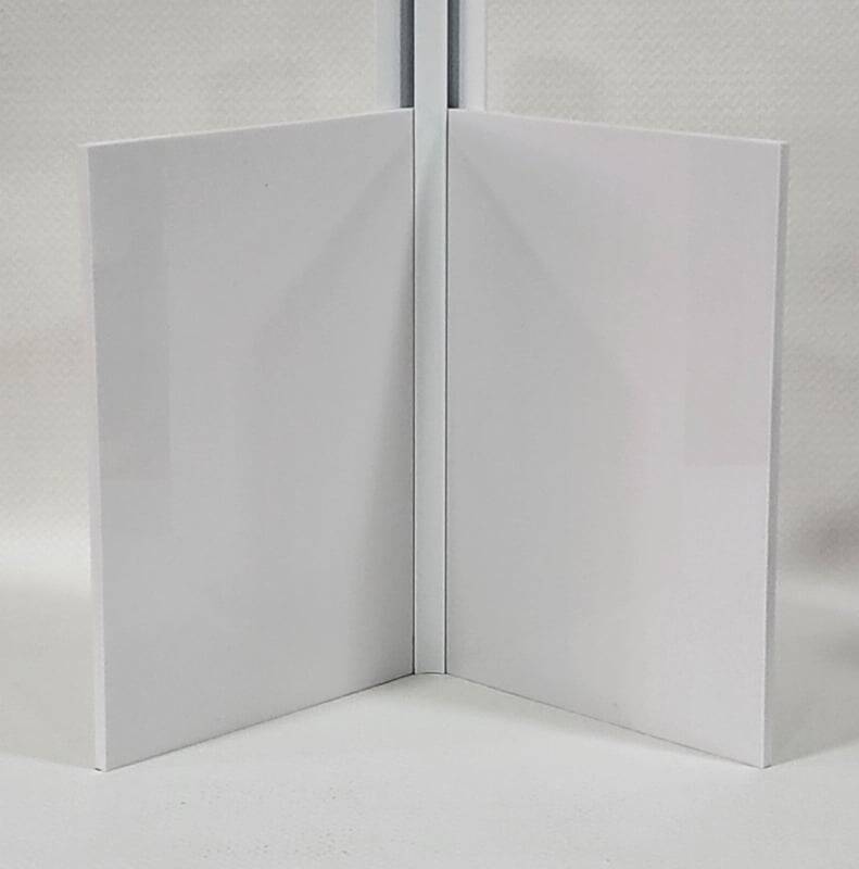 Bij gebruik van een inschuif hoekprofiel als binnenhoek, moet de plaat 10mm kleiner gemaakt worden dan de breedte van de muur. Op de achterste plaat van een U douche komen twee inschuifhoekprofielen en moet je deze dus 20mm kleiner maken.